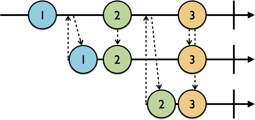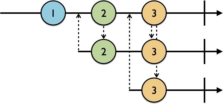 첫 번째 subscriber는 1 다음에 구독합니다. 그러므로 1 이벤트는 받지 못하고, 2와 3을 받게 됩니다.