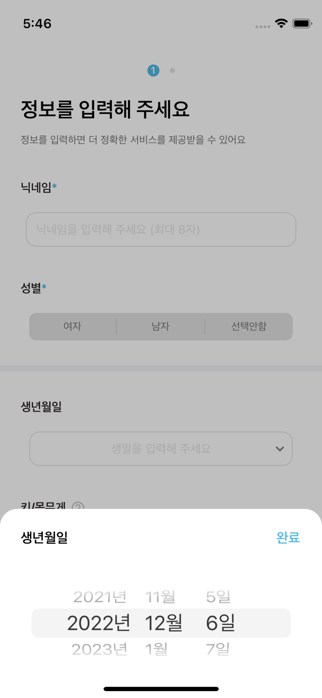 정보입력 화면 -> 생년월일 화면 전환하여 생일을 선택한 후, 완료 버튼을 누르면 해당 생년월일 화면이 dismiss됩니다.
